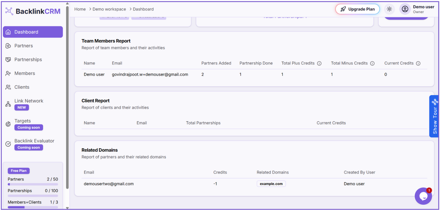 Shows a report of team members’ activities, including the number of partners and partnerships they added and created, along with their plus credits, minus credits, and total credits.