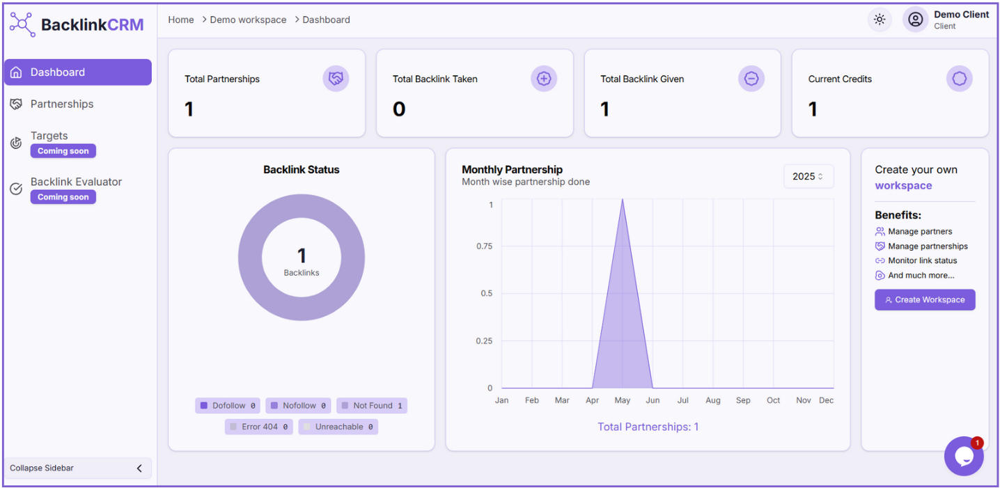 Click this button to create your own workspace, where you can add members, partners, and partnerships, and add clients.