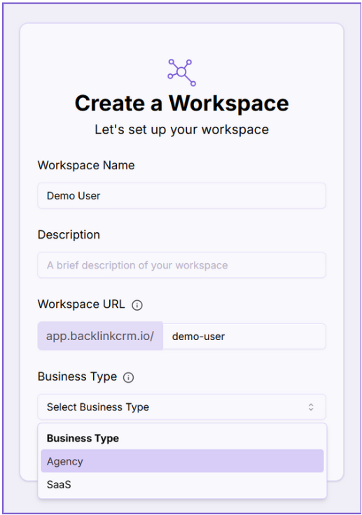 Choose the type of business you’re creating the workspace for (e.g., Agency, SaaS, etc.).