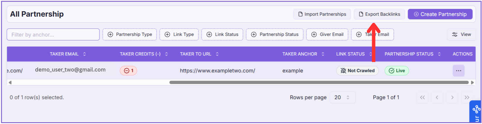 Exporting your partnerships/backlinks is quick and easy. With just one click, you can download all partnerships in your workspace as an .xlsx file.