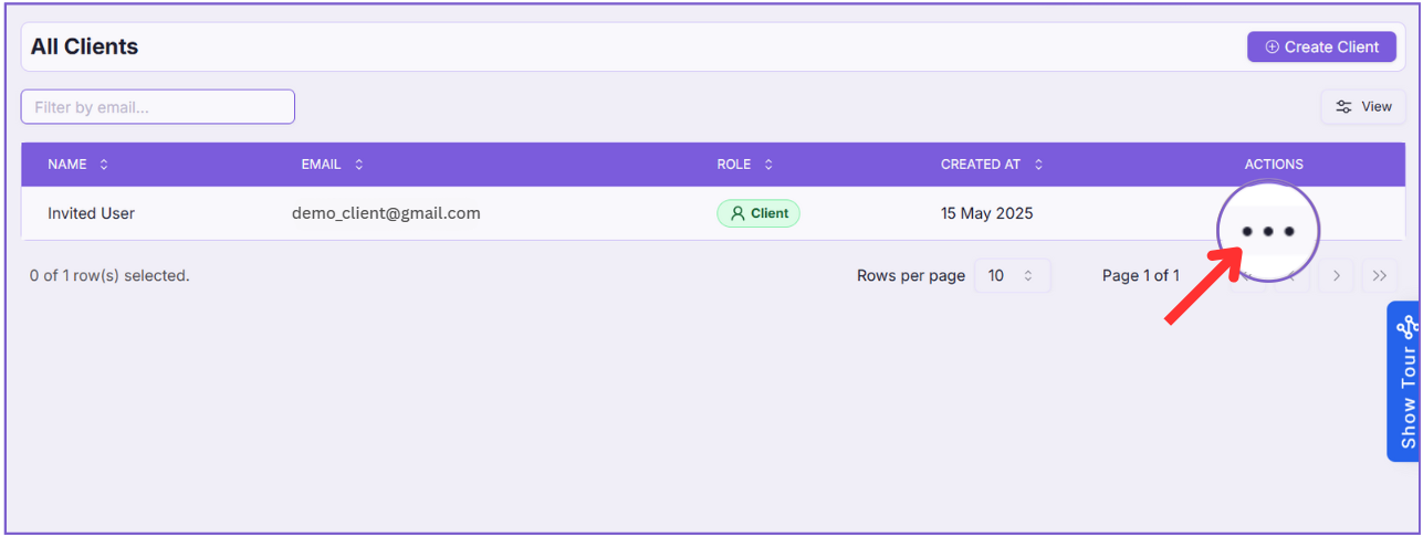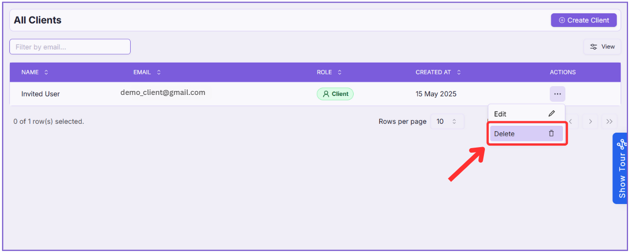 - On the All Clients page, locate the client you want to delete.