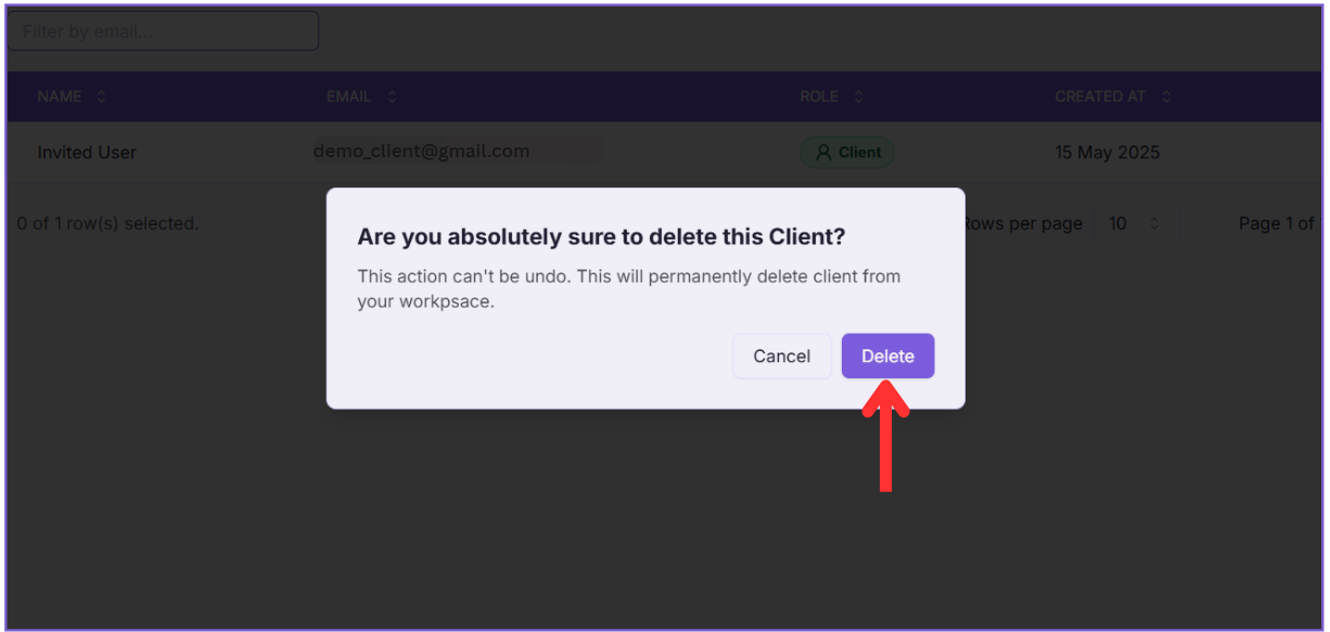 Note: Once you delete a client, it cannot be undone. The client will be permanently removed from your workspace.