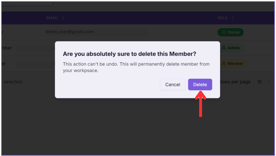 Note: Once you delete a member, it cannot be undone. The member will be permanently removed from your workspace.