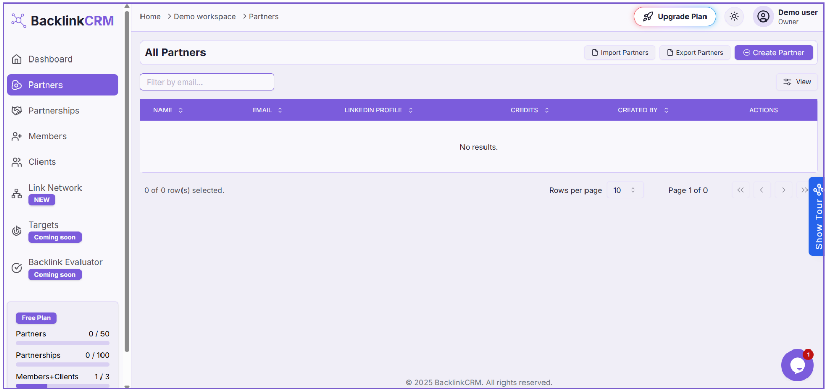 The Partners section is where you manage all the individual partners you collaborate with in BacklinkCRM. You can access this section by clicking on “Partners” in the sidebar.