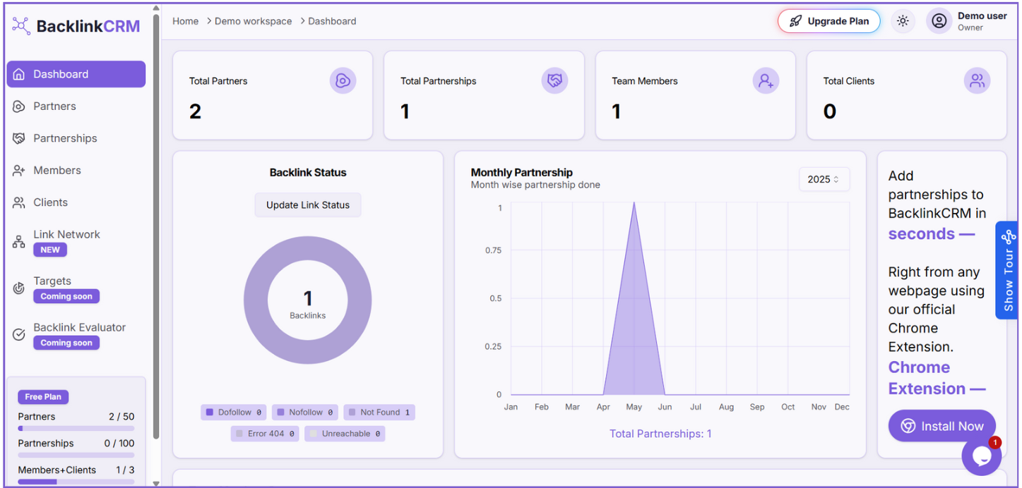 With this tool, you can create and track partnerships, add team members and clients, and see how backlinks are shared between different websites.